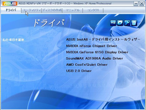 バージョンが確認できたところで、 マザーボードに付属しているCDを読み込ませます。 今回はASUSのマザーボードを使用しての解説になりますが、 どこのメーカーでも似たようなもんですので、参考にしてみてください(^^)