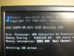 ですので、キーボードの【Pause】を押して止めて読みましょう!ここで(右写真)の上から3行目に ASUS M2NPV-VM ACPI BIOS Revision 1201とありますね。