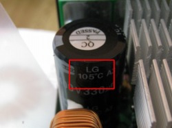 このコンデンサですが105℃という表記がされています。動作保証温度が105℃という意味です。105℃品は一般的な85℃品と比べて、同一の動作条件下では理論上約4倍の寿命を持ちます。