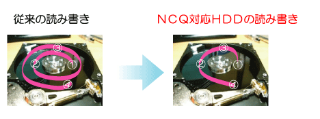 HDDというのはディスクが回転しながらデータを読み書きしていますが、従来のHDDだと1→2→3→4の順番に読み書きするしかなかったのですが、NCQ対応のHDDだと、一番効率が良くディスクを回転させる必要がないように、1→3→2→4という風に読み書きをしてくれます。