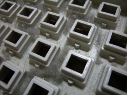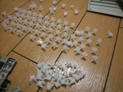 すべてのキーがはずれました! 大量のキーとプラスチック部品がでますので、なくさないように注意しましょう! 右写真はまるでインベーダーゲームです(笑)