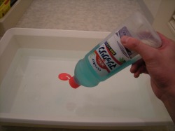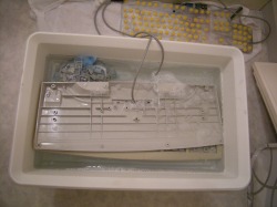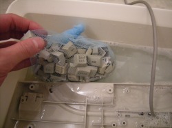 キーボードの表面と裏面を入れて、最後にネットに入ったキーをつけおきです!ちなみに裏面の方はUSBのコードがつながったまんまなので、 水につからないように注意しました。