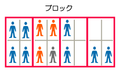 データが4つ入れる部屋をまとめて”ブロック”といいます。上のイラストでは、ブロックが4つありますね。だれもいない部屋は空きページで、新たにデータを保存できます。