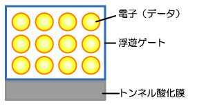 SSDのメモリの内部はこのようになっています。電子がデータで浮遊ゲートと呼ばれる部屋に格納されています。トンネル酸化膜は通常、電子を通さない絶縁体になっています。