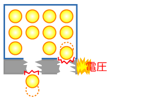 データを取り出したり保存したりする場合、トンネル酸化膜に電圧をかけます。すると上図のようにトンネル酸化膜に道ができ、電子(データ)が行き来できるようになります。