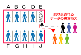 するとEの部屋のデータだけ、何度も繰り返しデータの書き換えが行われます。ここで1つ問題がありまして、 実はSSDにつかわれているフラッシュメモリは、書き換え回数が限られているのです。